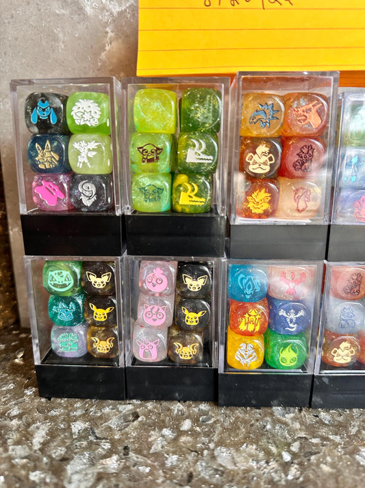 Pokemon Inspired 6 Dice Team D6 RPG DnD Gaming Polyhedral Anime Art Raichu Leafeon Treeko Meowth Bulbasaur Entei Mewtwo Ho Oh Mudkip Pichu