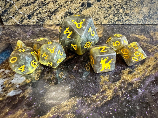Custom Jolteon Pokemon Inspired Polyset Dice Set Shiny Eeveelutions D6 RPG DnD Gaming Polyhedral Anime Art Vaporeon